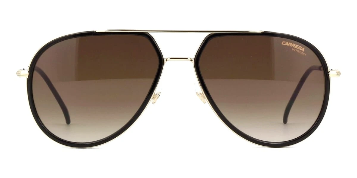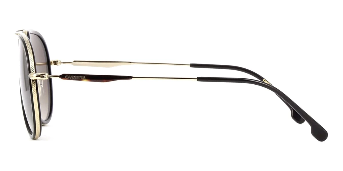 This aviator Carrera sunglass comes in a shiny black and gold frame with brown gradient lenses.