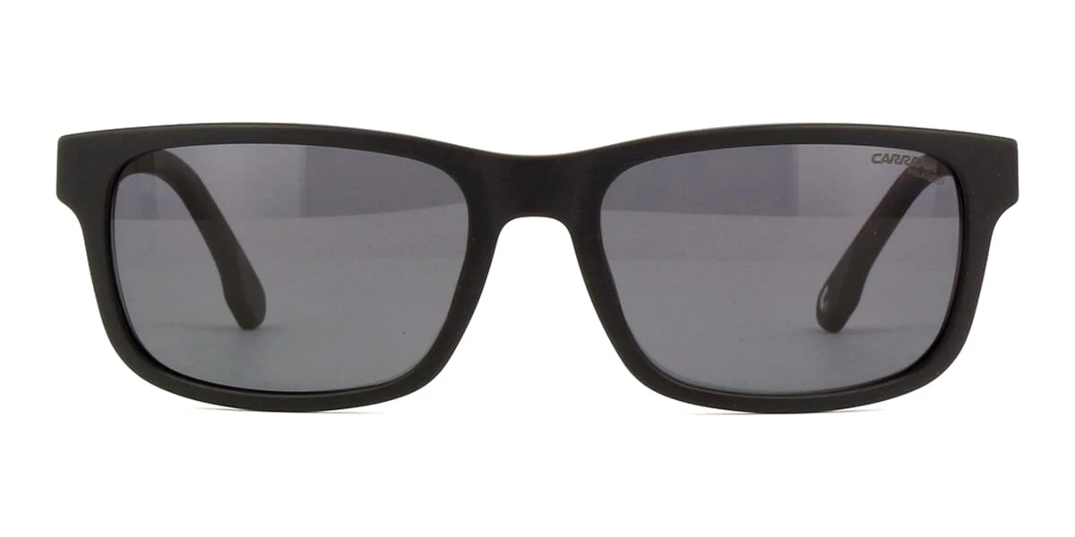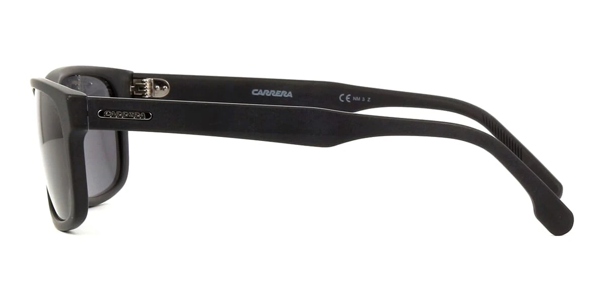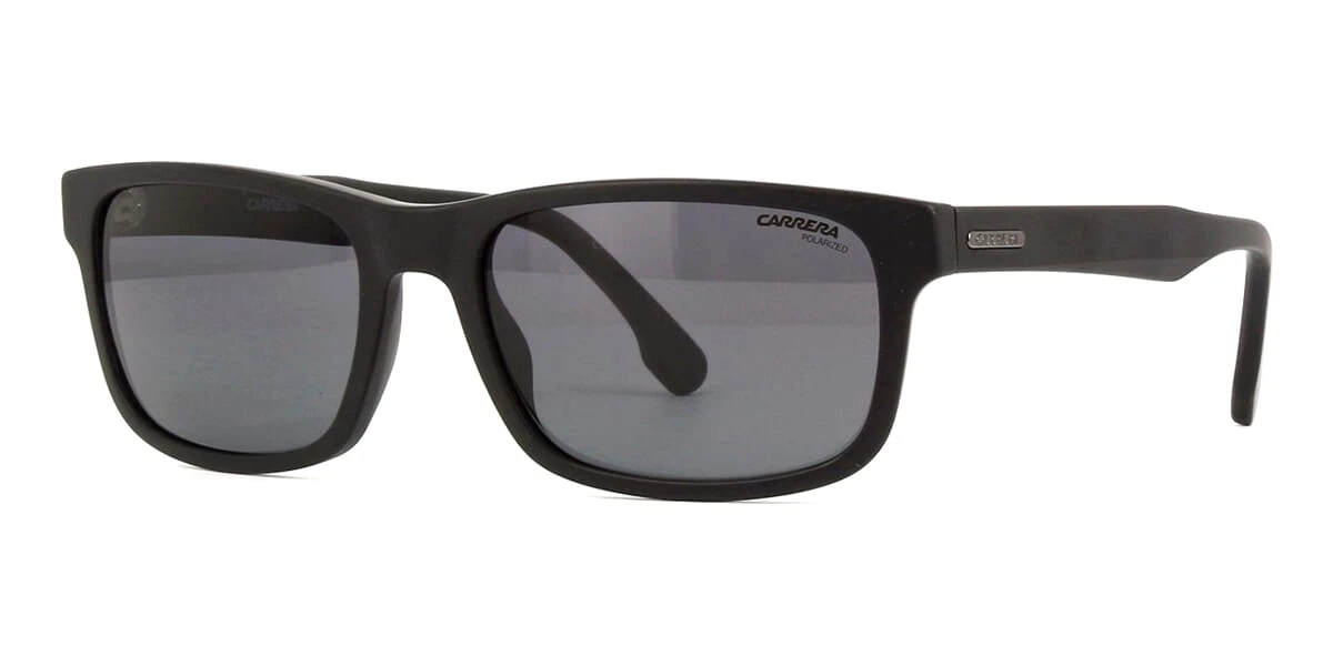 This square Carrera sunglass comes in a matte black frame with grey polarised lenses.