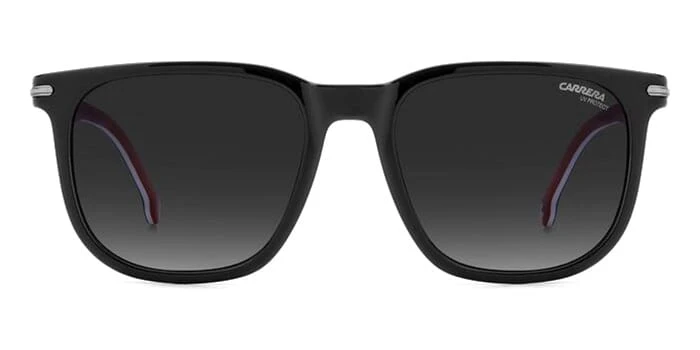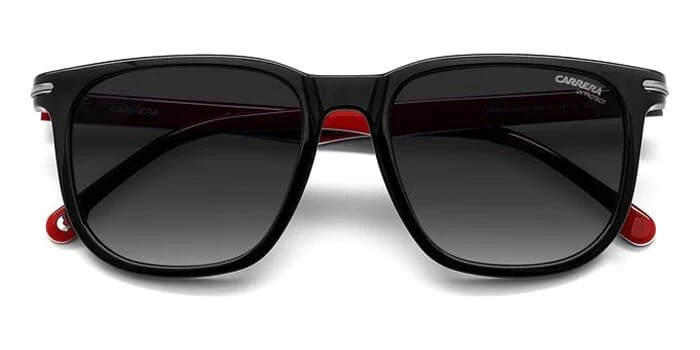 This square Carrera sunglass comes in a black with red frame with grey gradient lenses.