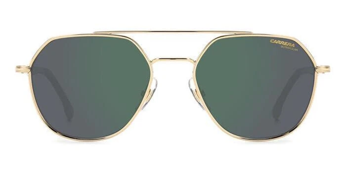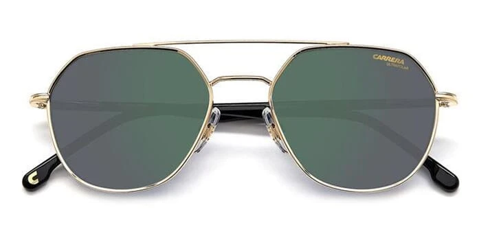 This round Carrera sunglass comes in a gold frame with grey with green flash mirror polarised lenses.