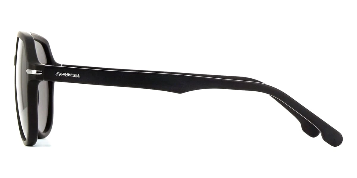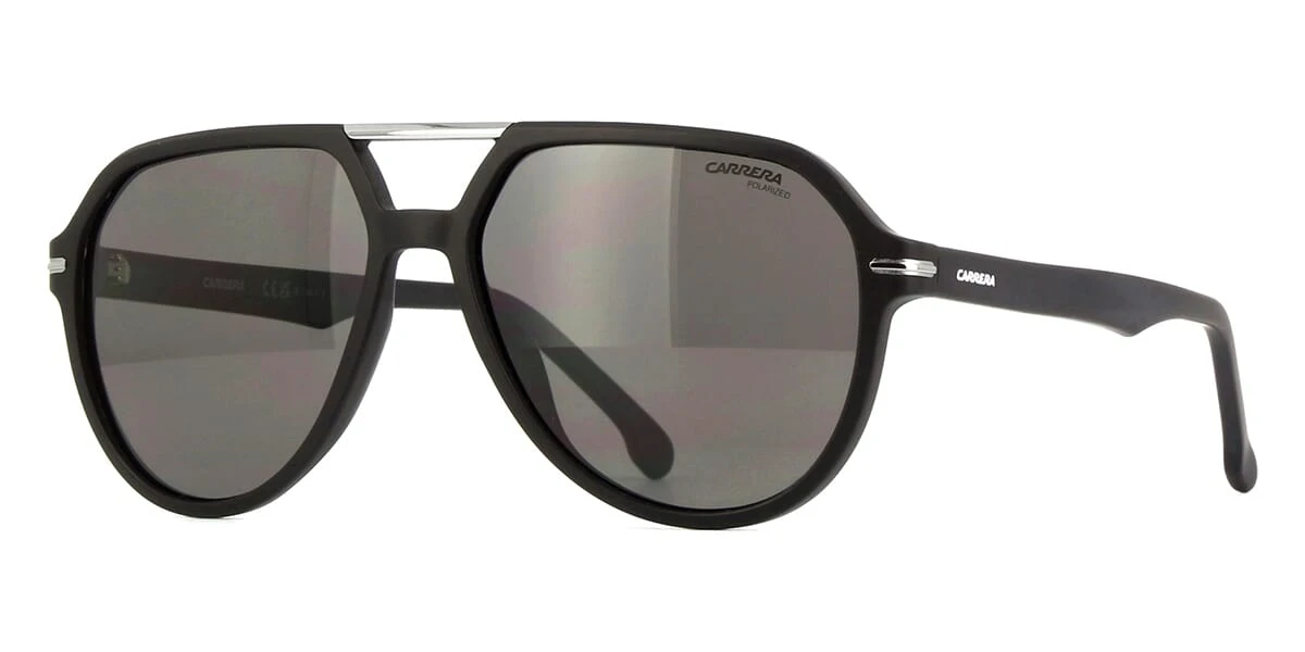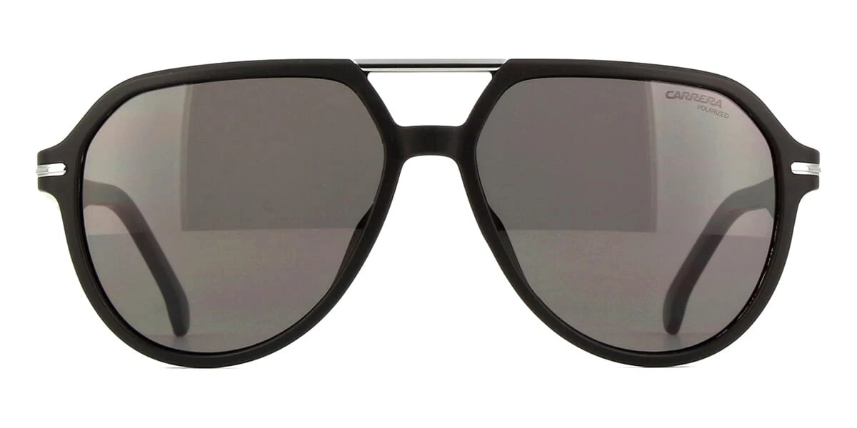 This aviator Carrera sunglass comes in a matte black frame with light grey polarised lenses.
