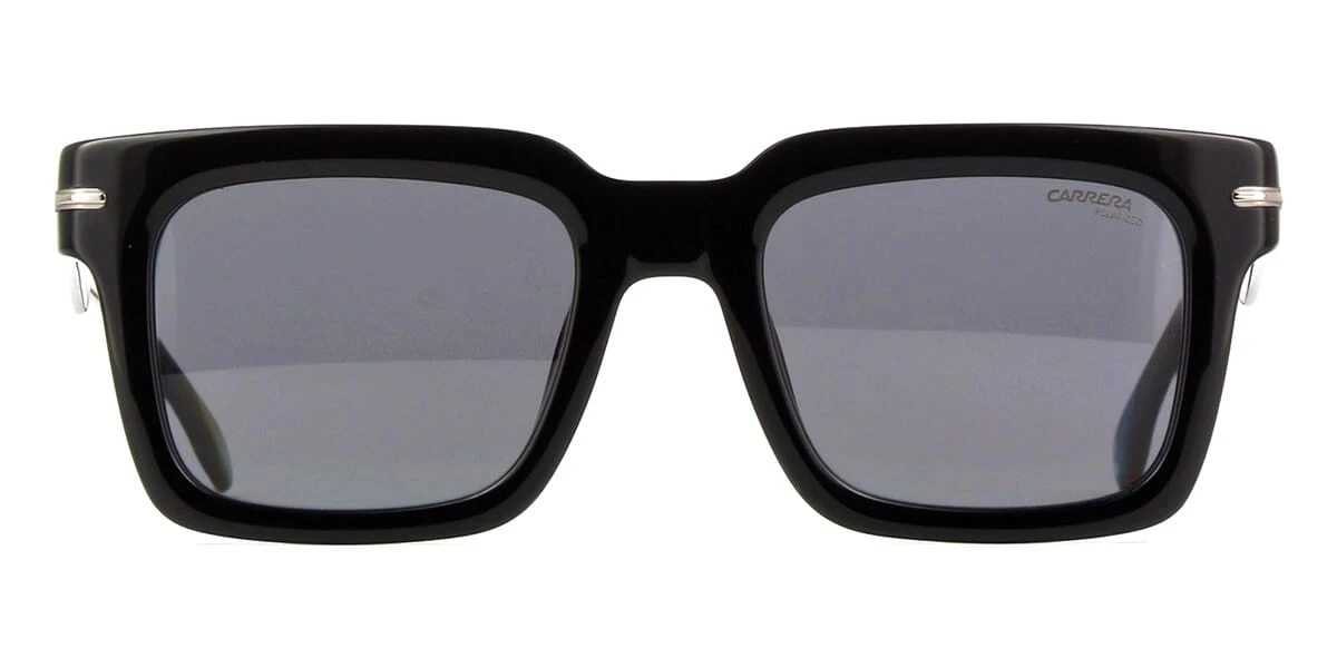 This square Carrera sunglass comes in a shiny black frame with light grey polarised lenses.