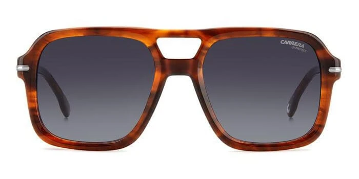 This square Carrera sunglass comes in a brown horn frame with grey lenses.