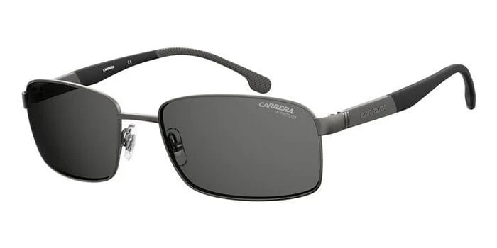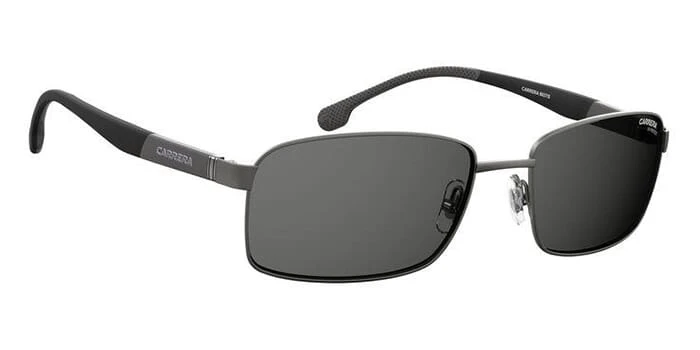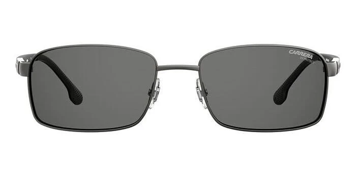 This rectangular Carrera sunglass comes in a semi matte dark ruthenium frame with grey lenses.