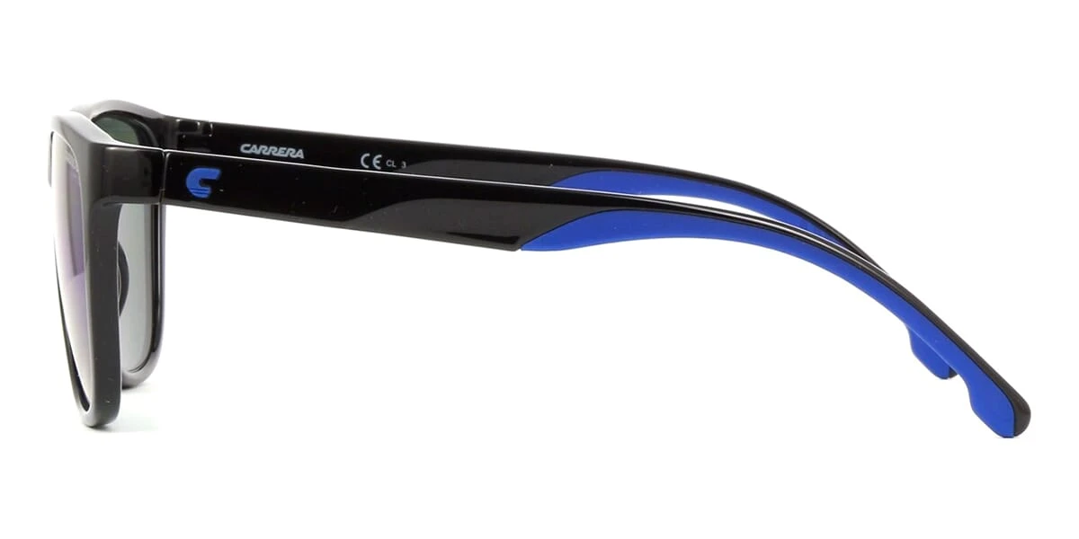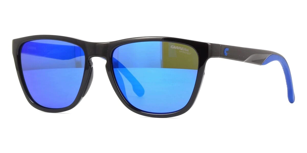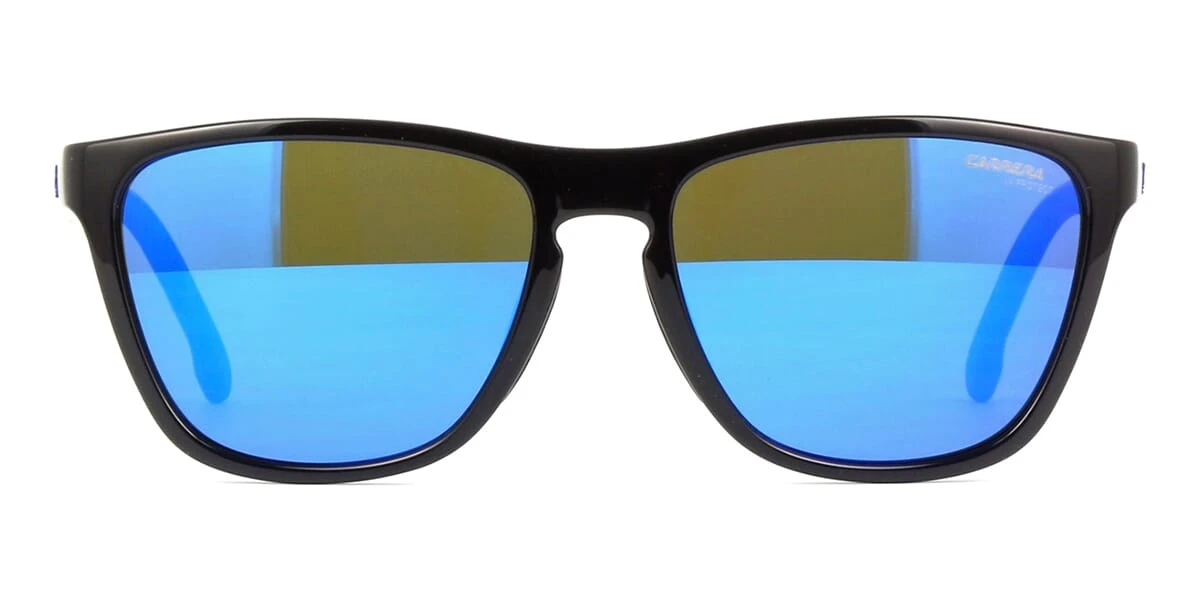 This wayfarer Carrera sunglass comes in a shiny black frame with green with blue mirror lenses.