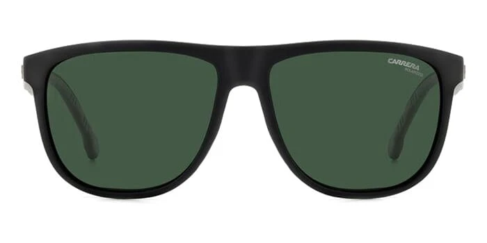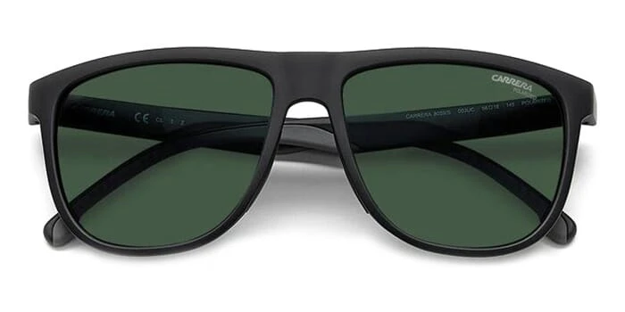 This wayfarer Carrera sunglass comes in a matte black frame with green polarised lenses.