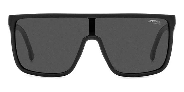 This shield Carrera sunglass comes in a matte black frame with grey lenses.