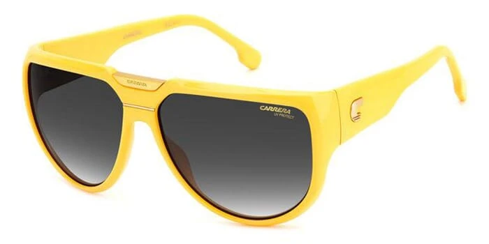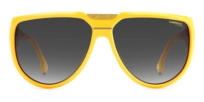 This aviator Carrera sunglass comes in a yellow frame with grey gradient lenses.