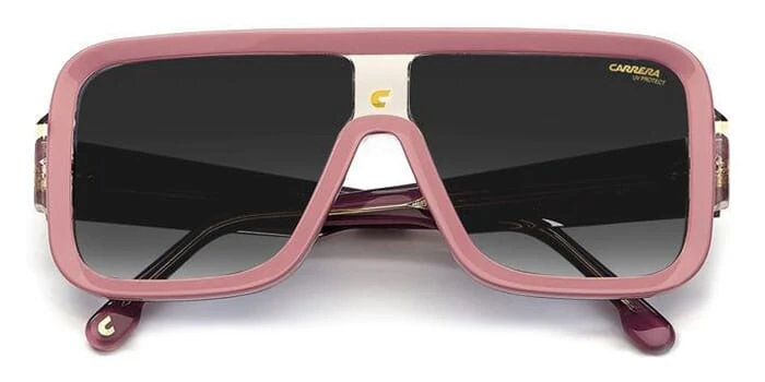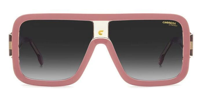 This square Carrera sunglass comes in a dark pink with beige crystal frame with grey gradient lenses.