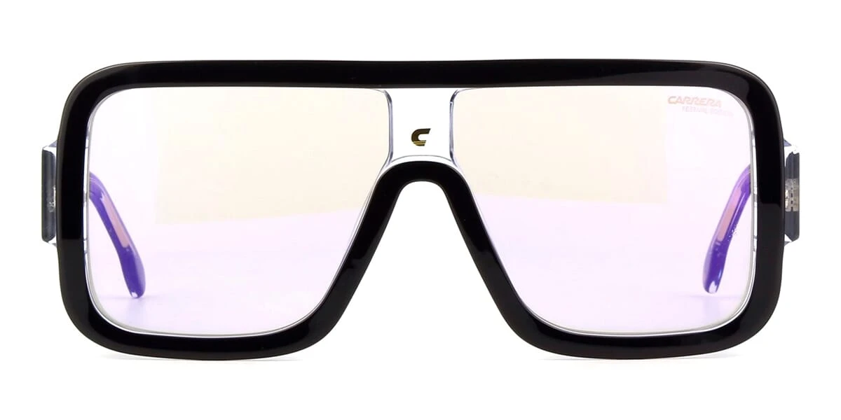 This square Carrera sunglass comes in a shiny black crystal frame with clear with red flash mirror lenses.