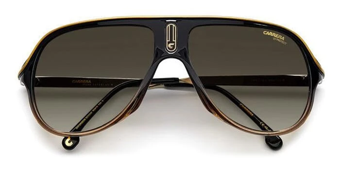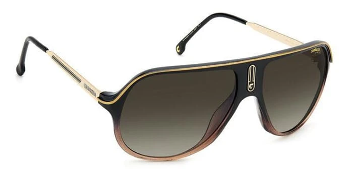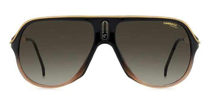 This aviator Carrera sunglass comes in a black to shaded brown crystal fade frame with grey gradient lenses.