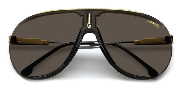 This aviator Carrera sunglass comes in a black and gold frame with black lenses.