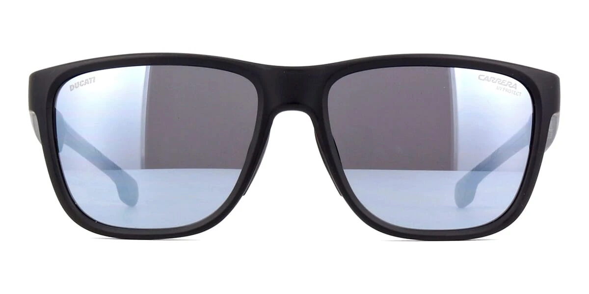 This square Carrera sunglass comes in a matte black frame with grey with light silver mirror lenses.