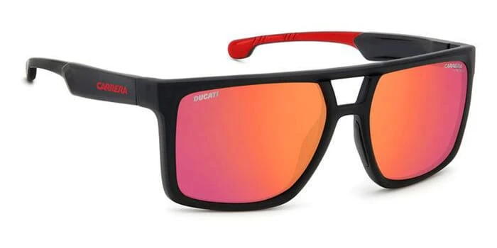 This square Carrera sunglass comes in a black red frame with grey lens with red mirror lenses.