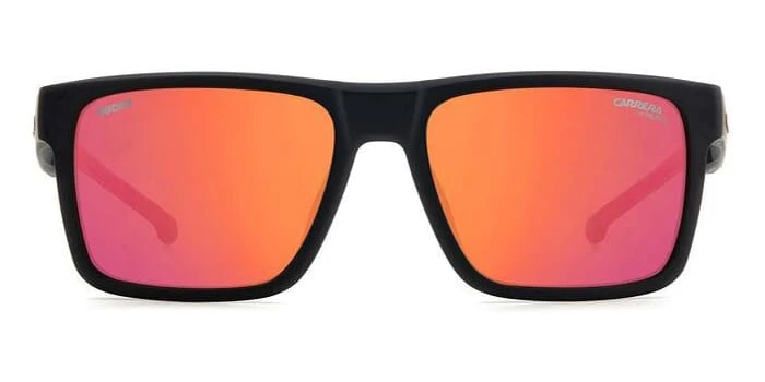 This square Carrera sunglass comes in a black red frame with blue with red mirror lenses.