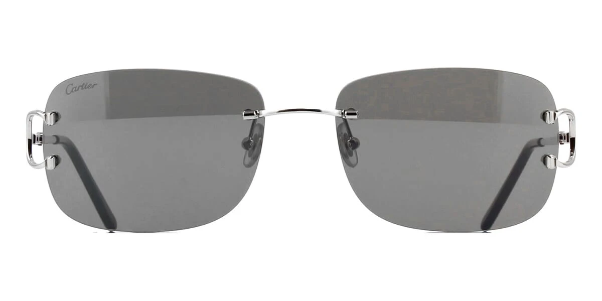This square Cartier sunglass comes in a shiny silver frame with grey with light mirror lenses.