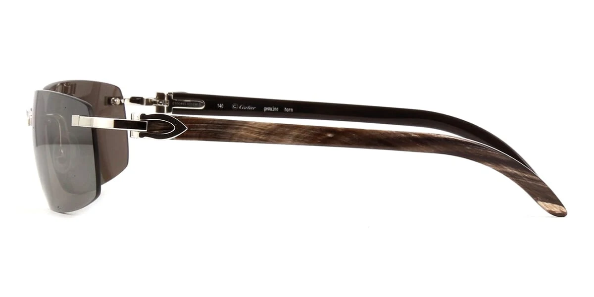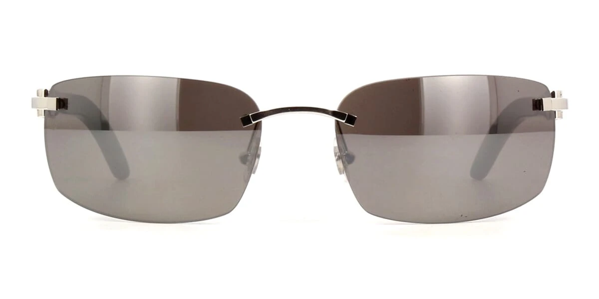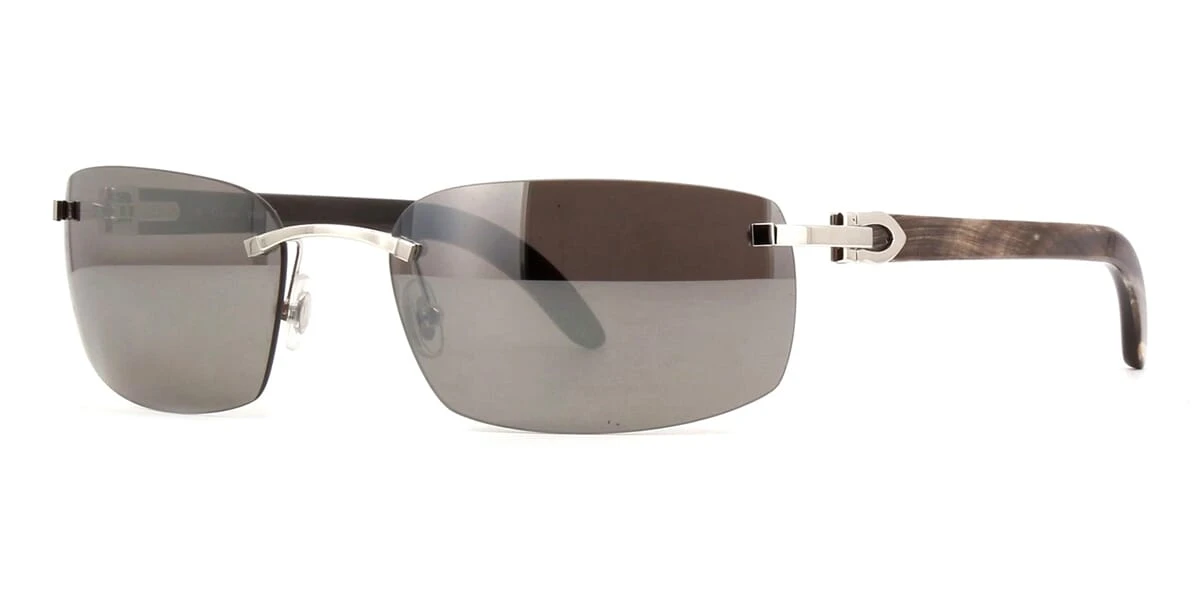 This square Cartier sunglass comes in a shiny silver with genuine buffalo horn rimless frame with grey with light silver mirror lenses.