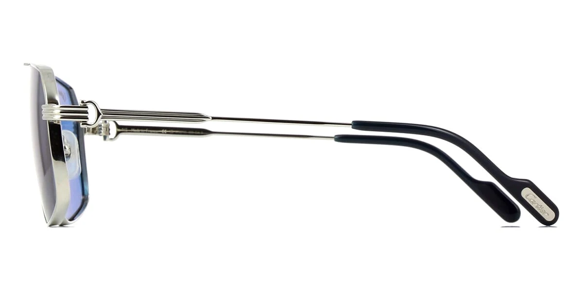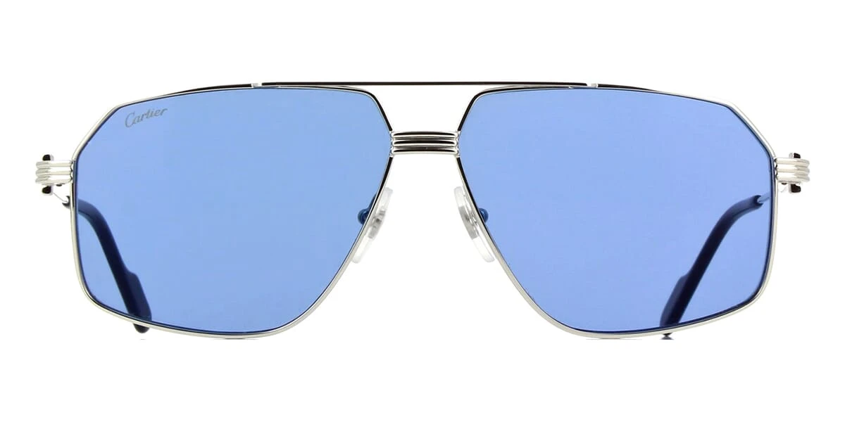 This square Cartier sunglass comes in a shiny silver frame with light blue lenses.