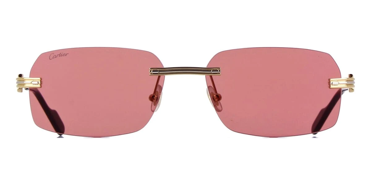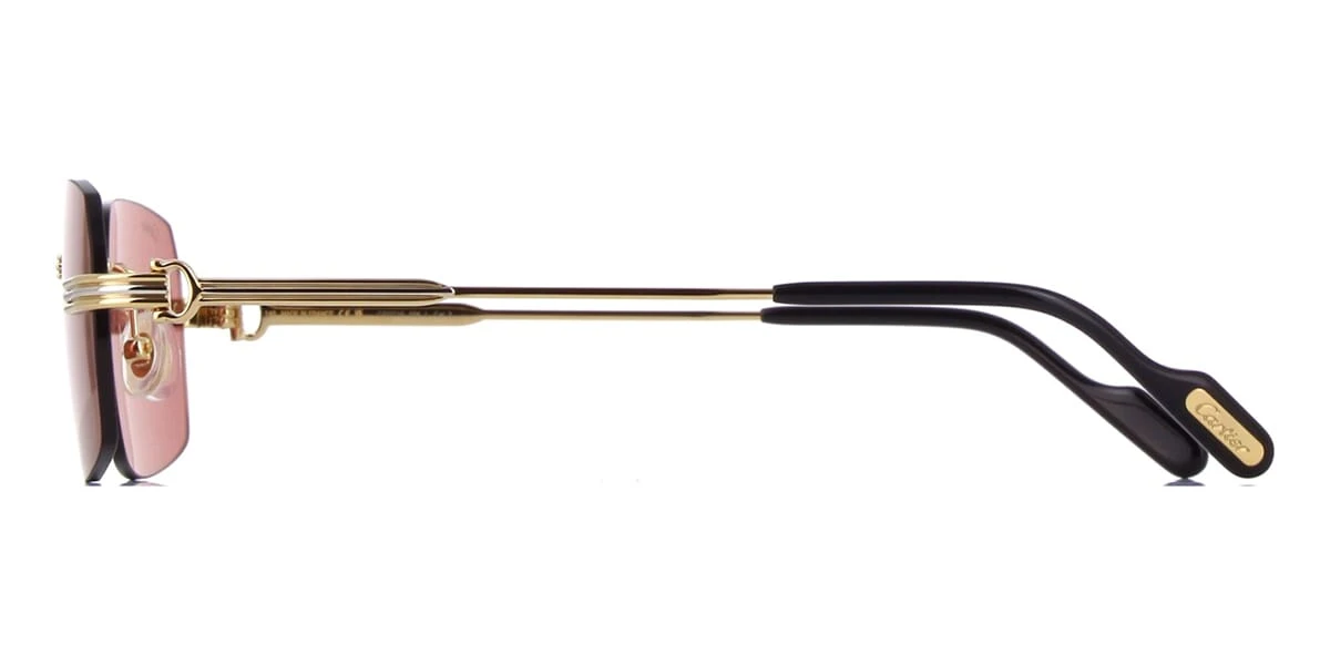 This rectangular Cartier sunglass comes in a shiny gold frame with red with light mirror lenses.