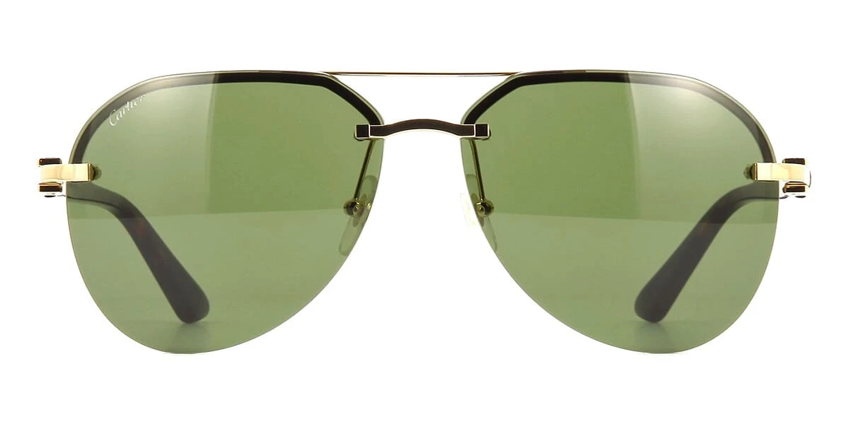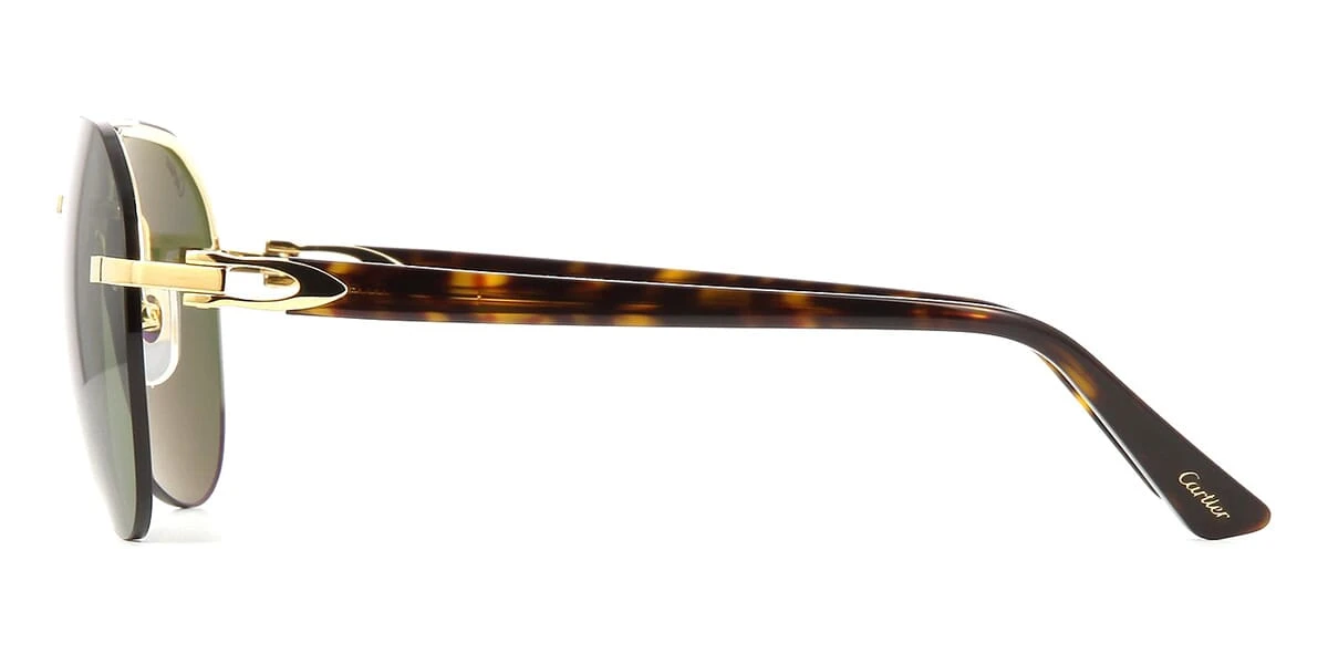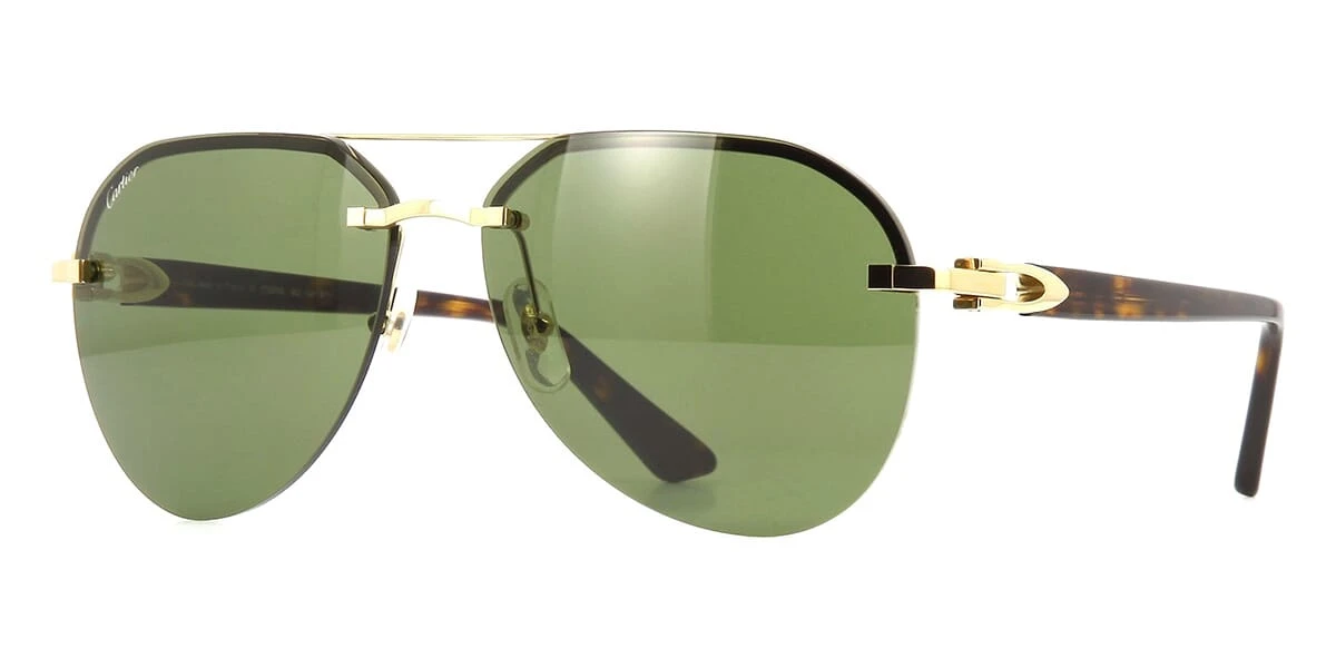 This aviator Cartier sunglass comes in a gold and havana frame with green lenses.