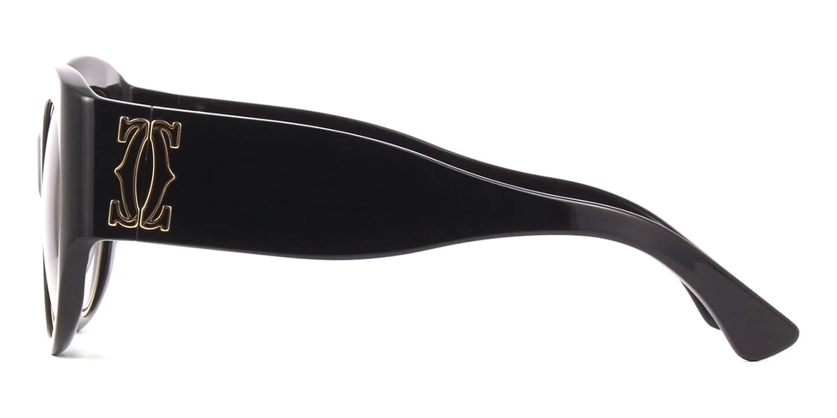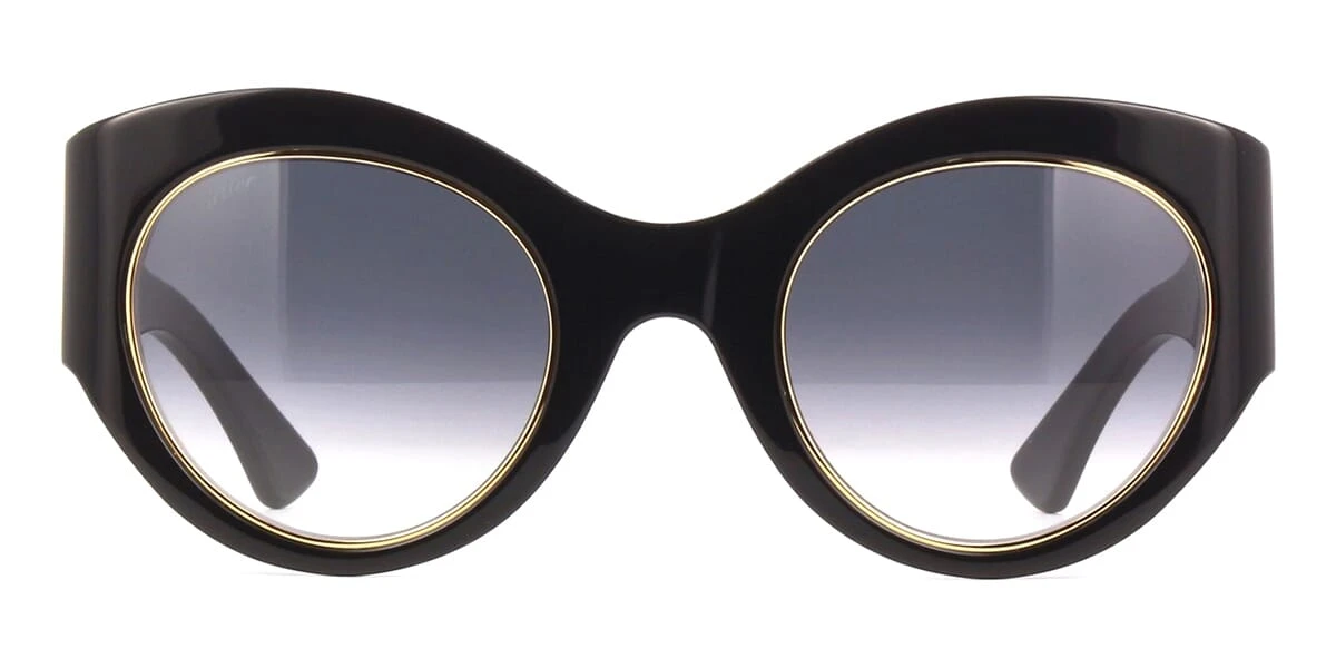 This round Cartier sunglass comes in a black and gold frame with grey gradient with light mirror lenses.