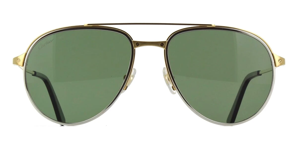 This aviator Cartier sunglass comes in a gold and silver frame with dark green polarised lenses.