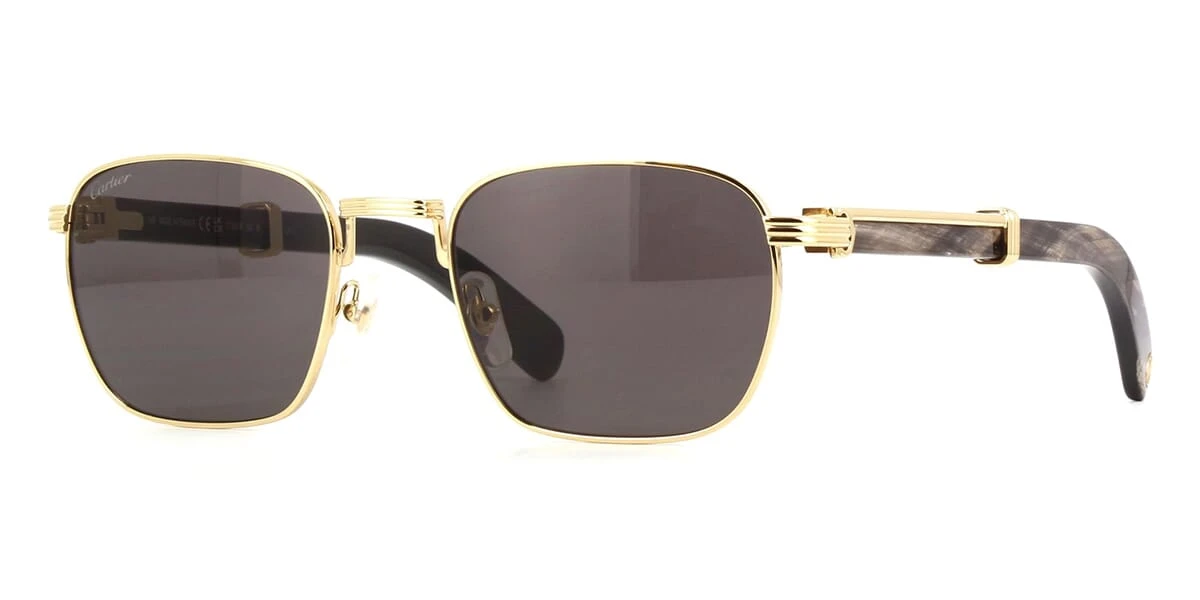 This square Cartier sunglass comes in a gold with black real buffalo horn frame with grey smoke lenses.
