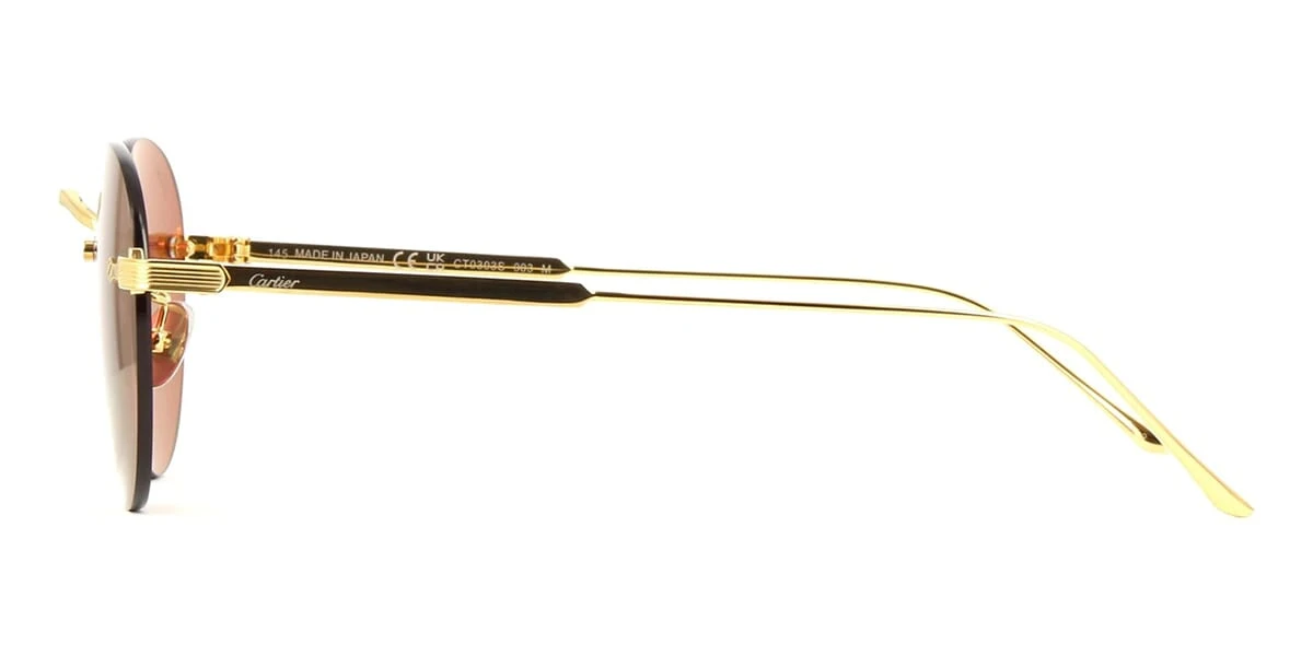 This round Cartier sunglass comes in a shiny gold frame with red lenses.