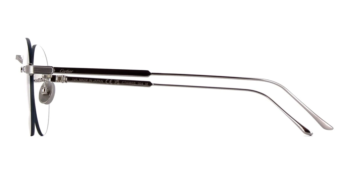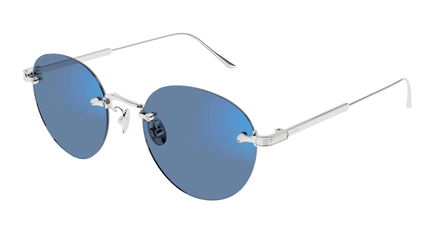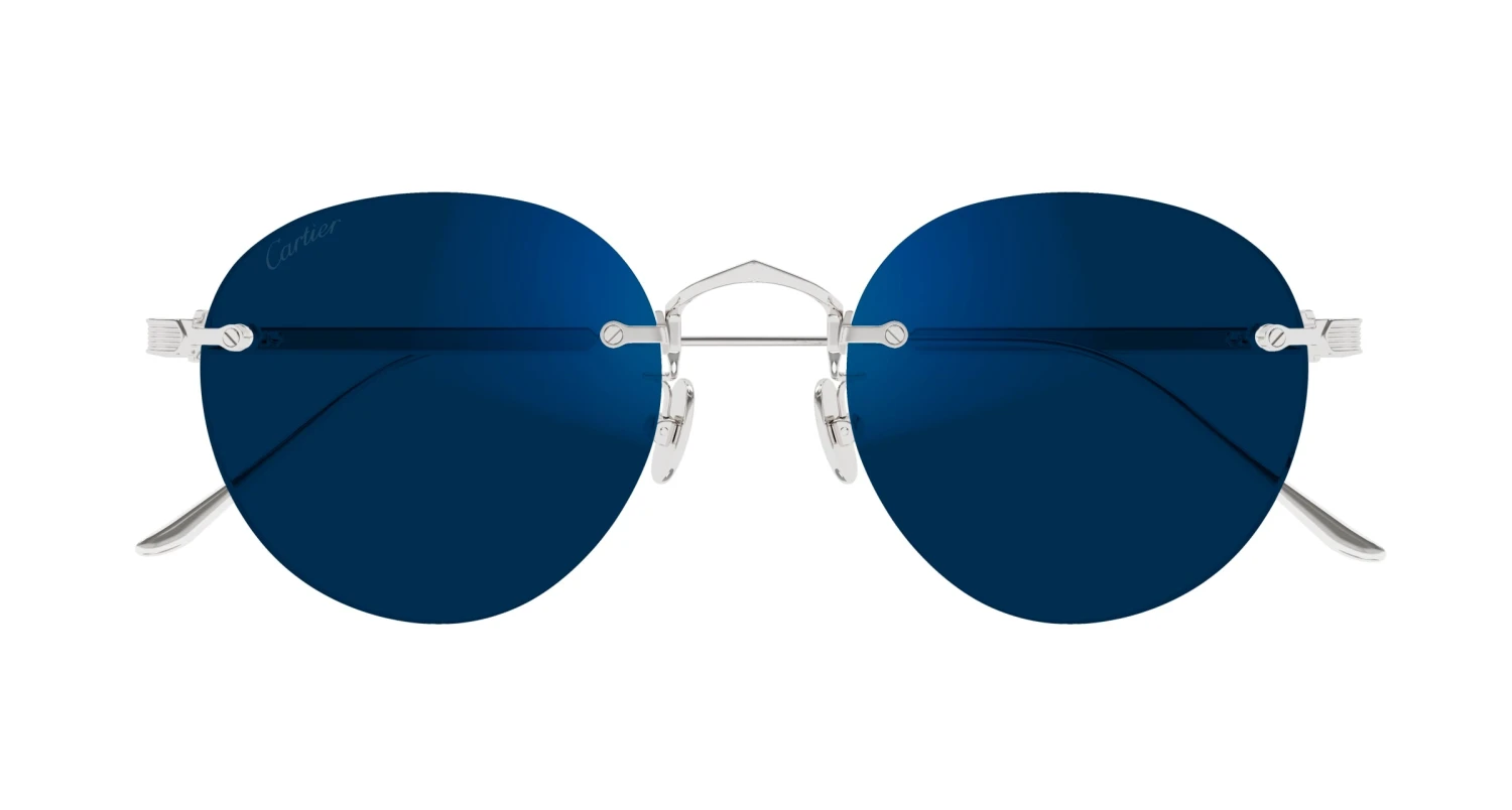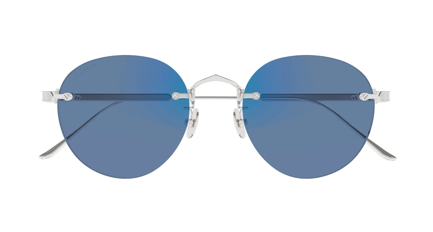 This round Cartier sunglass comes in a shiny silver frame with clear to blue photochromic with blue control lenses.