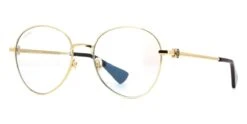 This round Cartier sunglass comes in a shiny gold frame with clear to violet blue & beyond photochromic lenses.