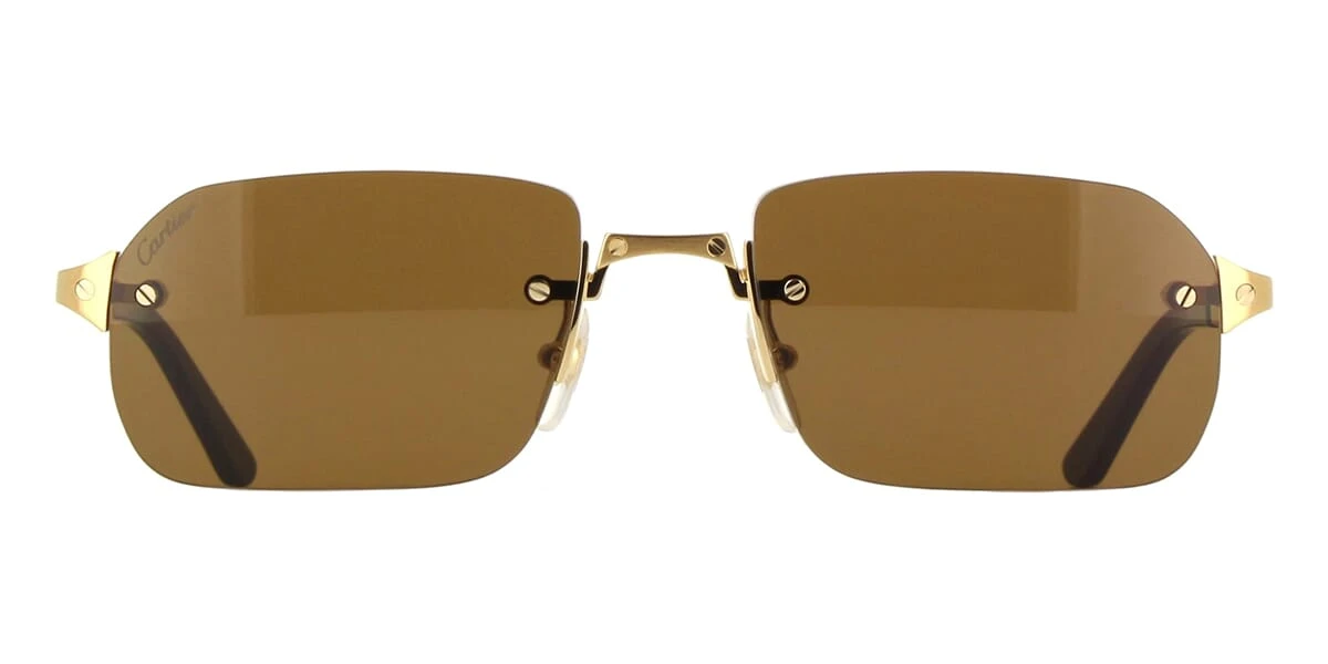 This square Cartier sunglass comes in a shiny gold frame with brown with light mirror lenses.