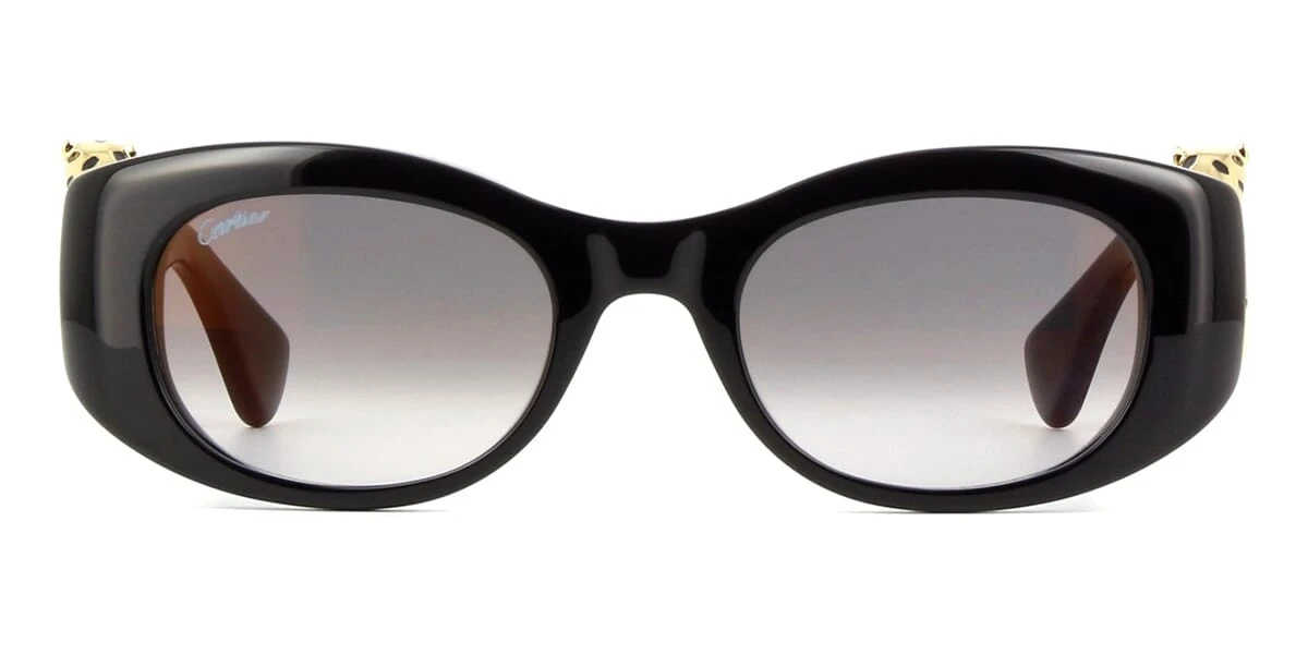 This cat eye Cartier sunglass comes in a shiny black with panther c frame with grey gradient with light mirror lenses.