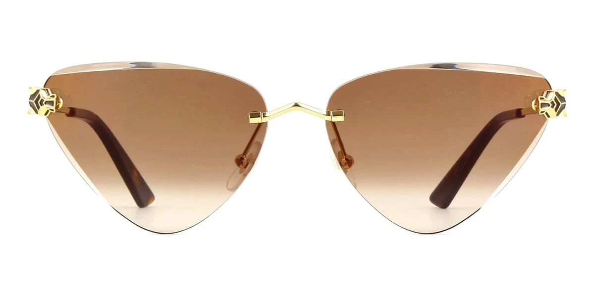 This cat eye Cartier sunglass comes in a shiny gold frame with brown gradient with golden flash mirror lenses.