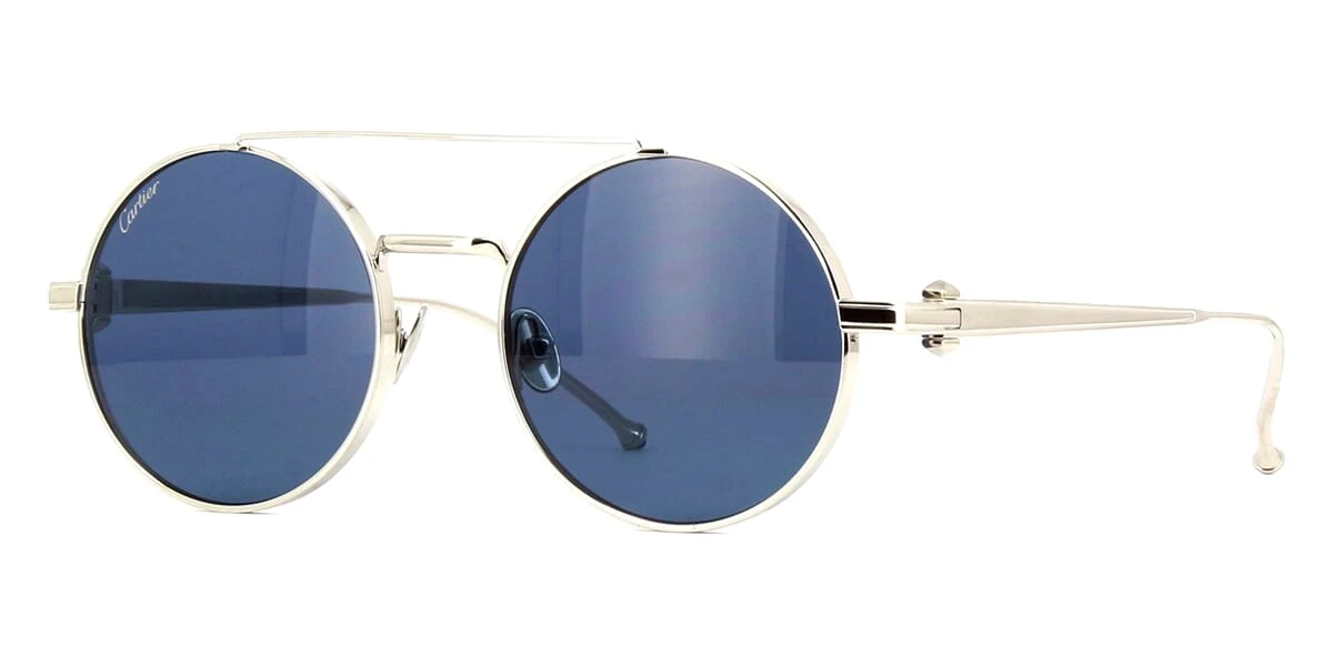 This round Pasha de Cartier sunglass comes in a shiny silver frame with blue lenses.