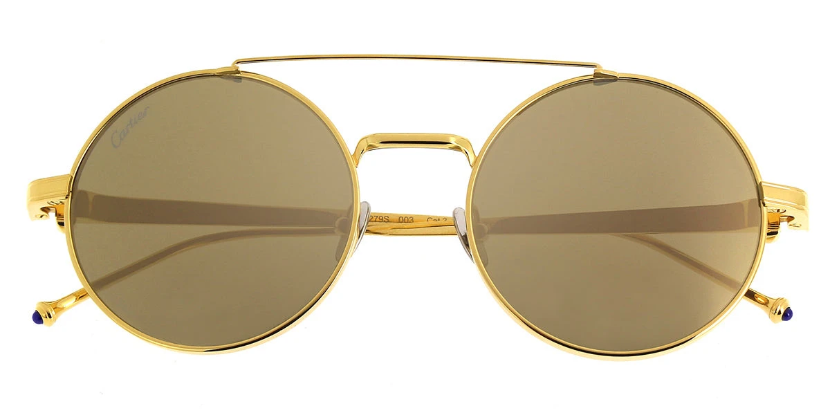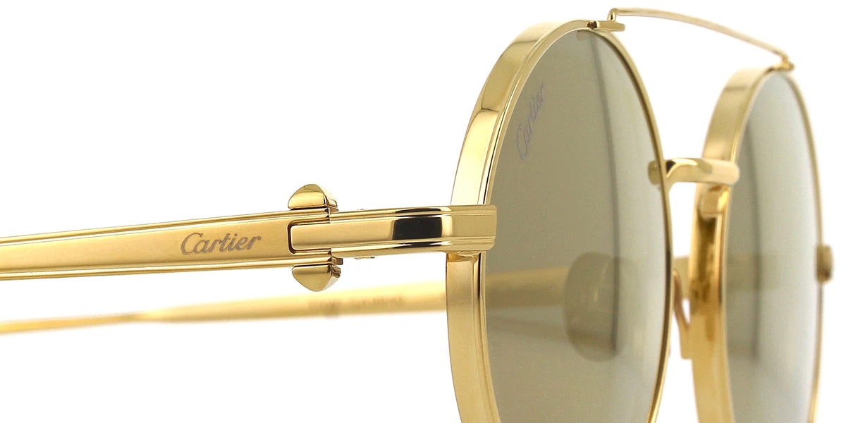 This round Cartier sunglass comes in a gold frame with brown with gold mirror lenses.
