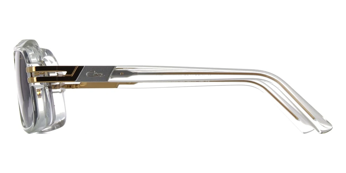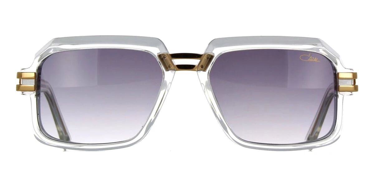This square Cazal sunglass comes in a shiny gold and crystal frame with grey gradient with light mirror lenses.