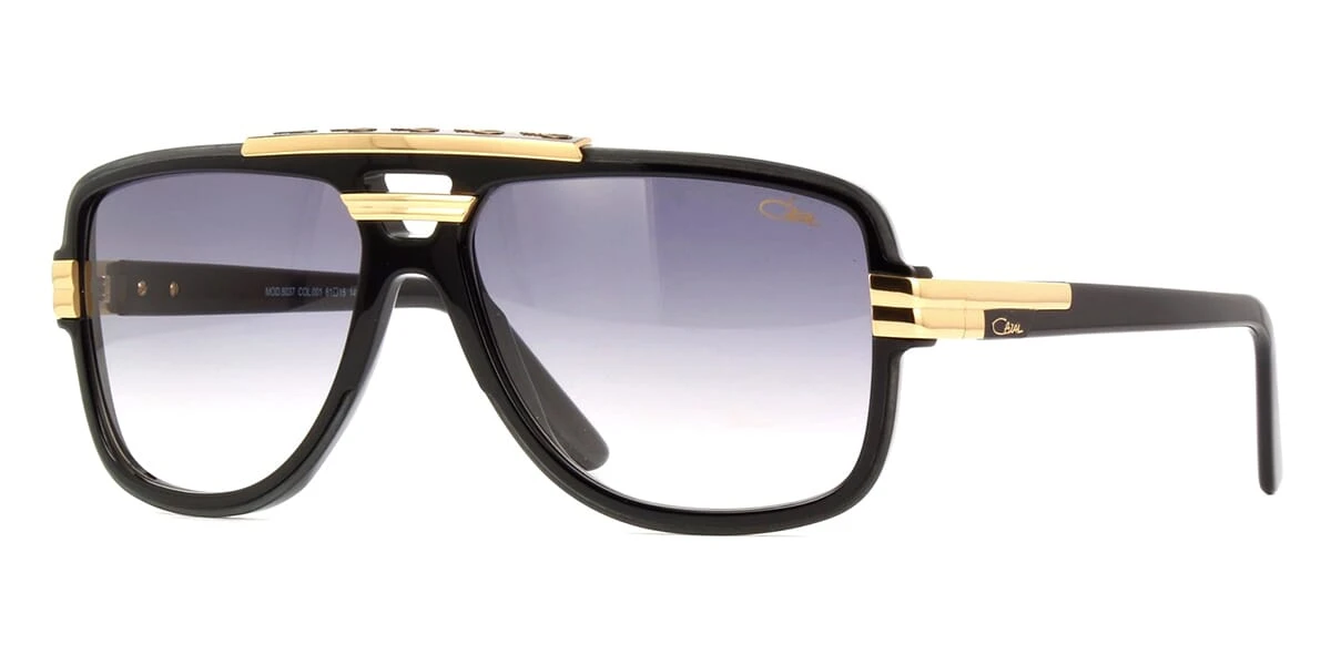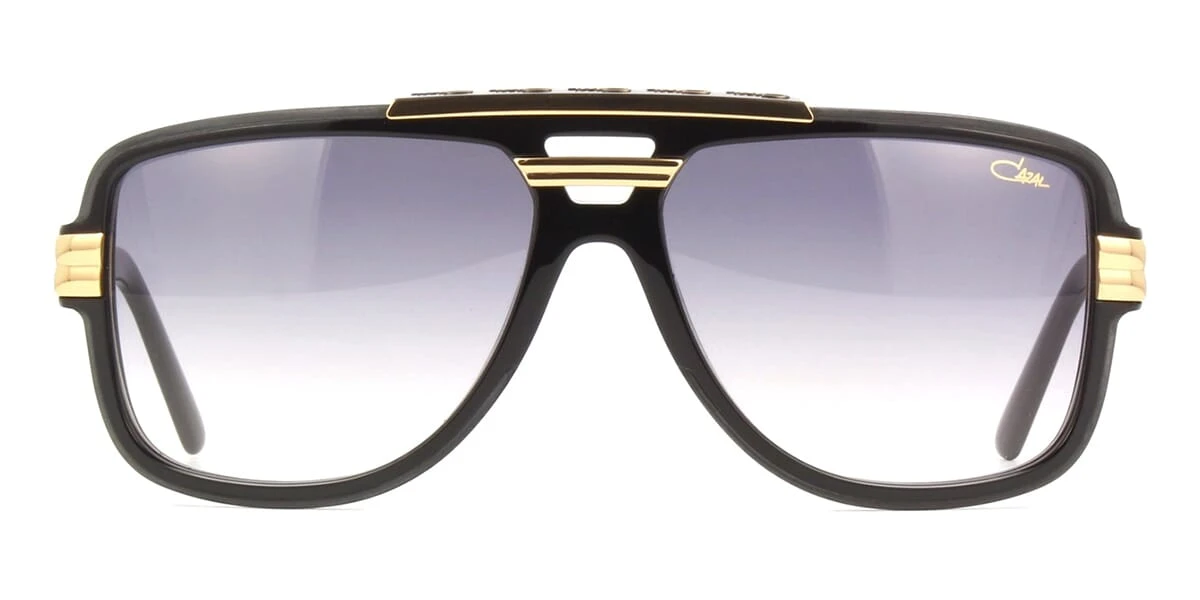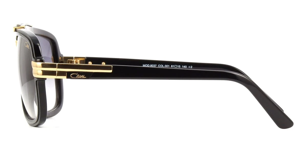 This square Cazal sunglass comes in a black and gold frame with grey gradient lenses.