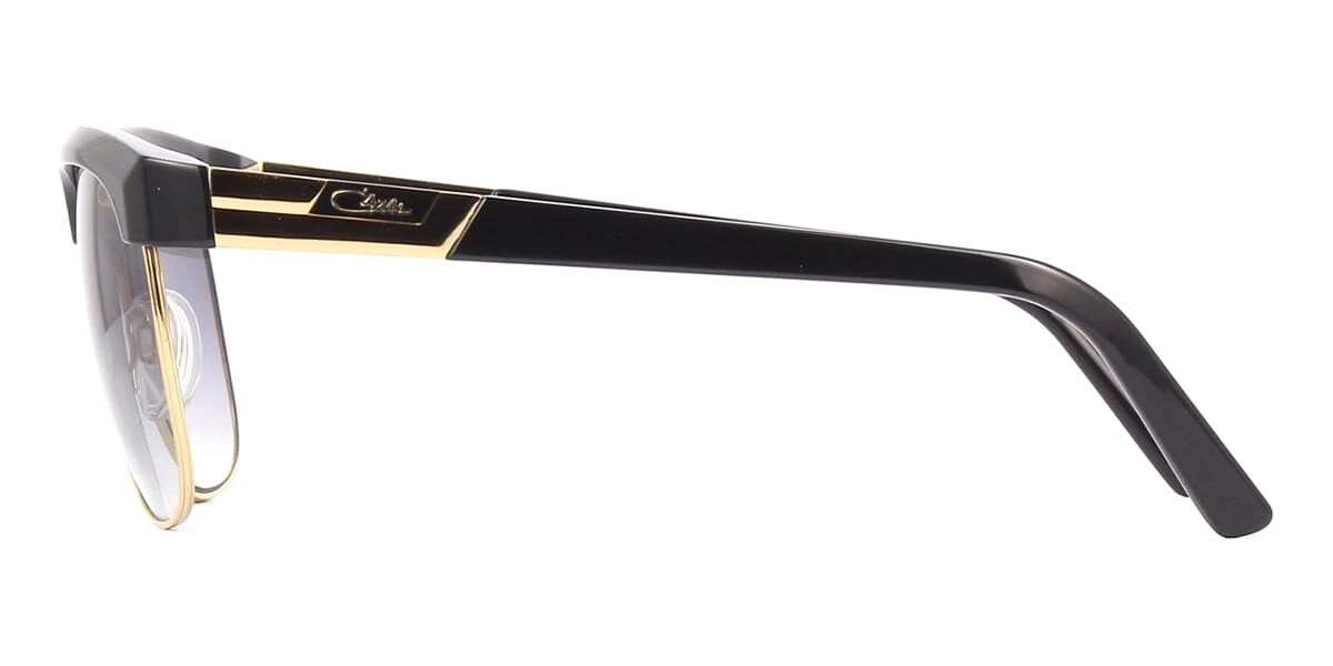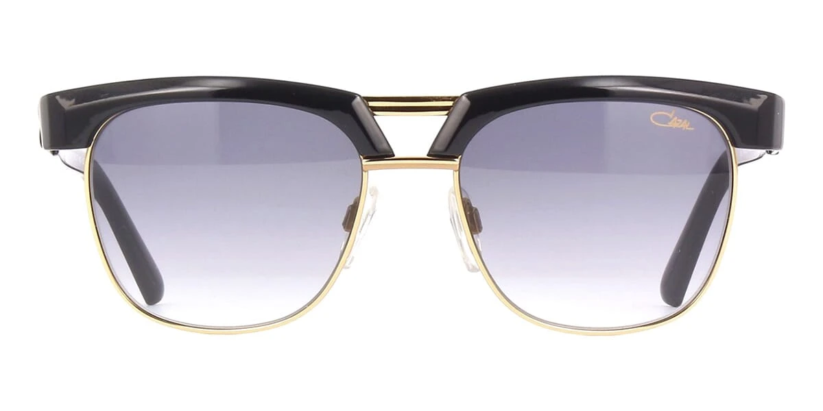 This square Cazal sunglass comes in a black and gold frame with grey gradient lenses.