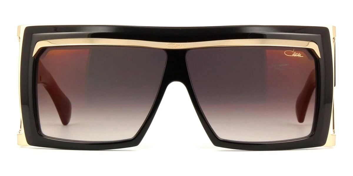 This square Cazal sunglass comes in a shiny black with gold frame with grey gradient with ar coated lenses.