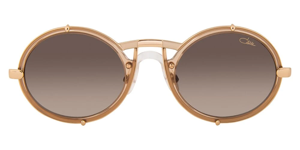 This round Cazal sunglass comes in a champagne gold frame with brown gradient lenses.