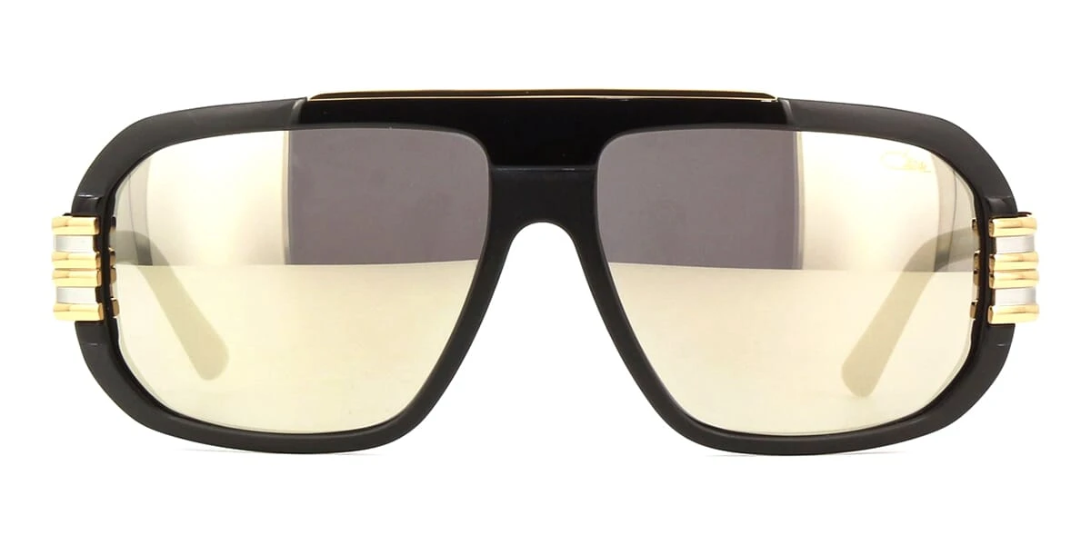 This square Cazal sunglass comes in a matte black with gold frame with grey with flash mirror lenses.