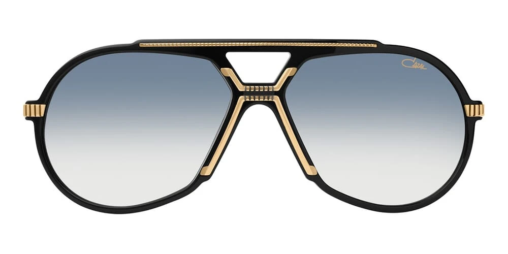This square Cazal sunglass comes in a black and gold frame with blue gradient silver mirror coated lenses.