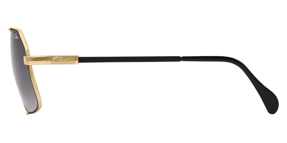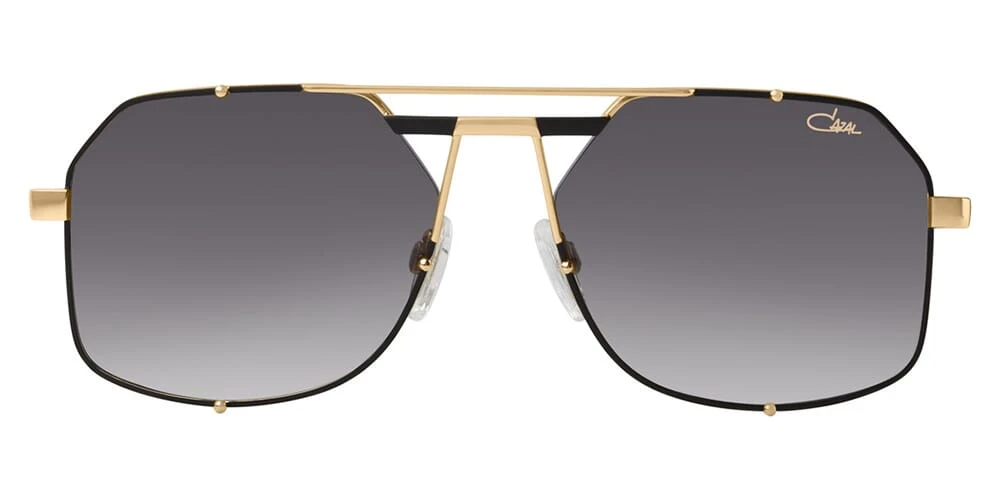 This square Cazal sunglass comes in a black and gold frame with grey gradient lenses.