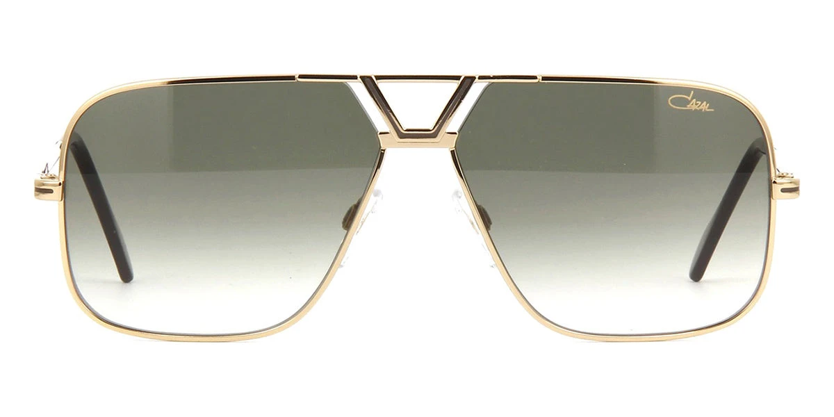 This square Cazal sunglass comes in a gold frame with green gradient lenses.