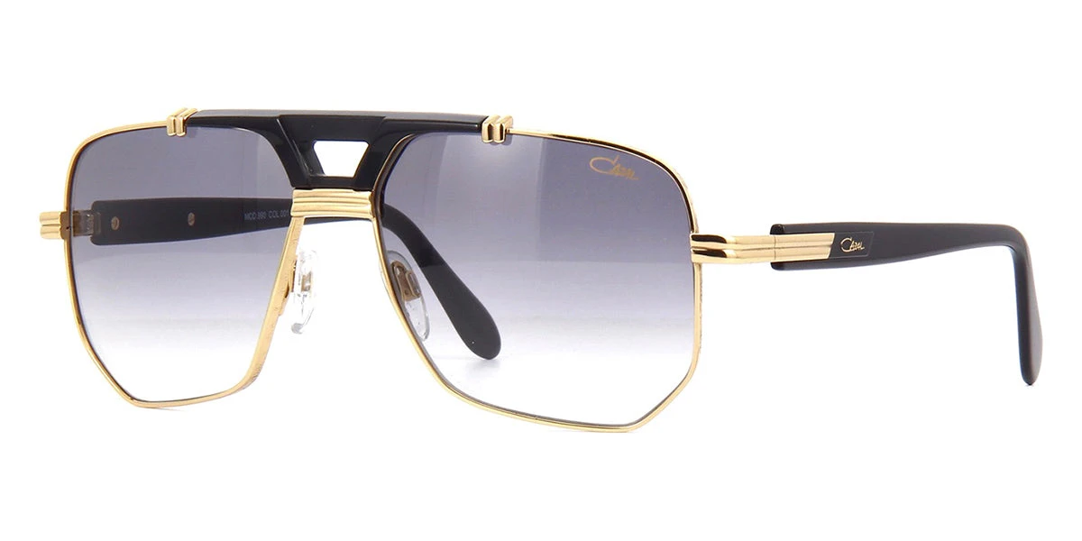 This square Cazal sunglass comes in a gold and black frame with grey gradient lenses.
