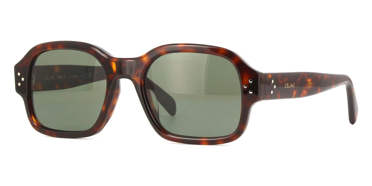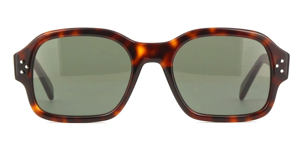 This square Celine sunglass comes in a shiny dark havana frame with green with light mirror lenses.