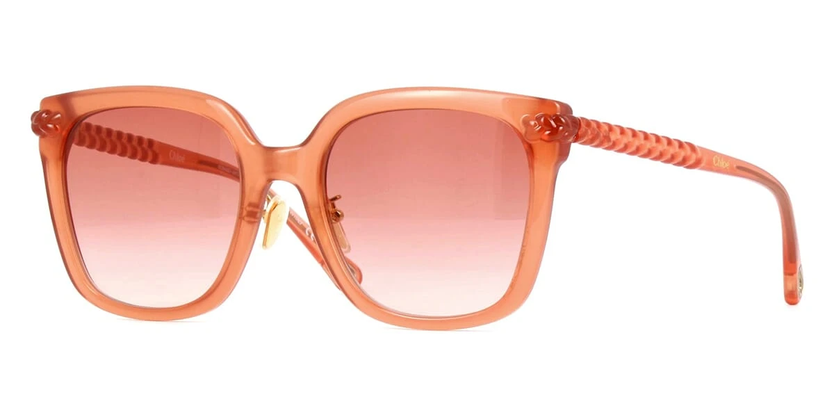 This square Chloe sunglass comes in a nude crystal frame with orange gradient lenses.