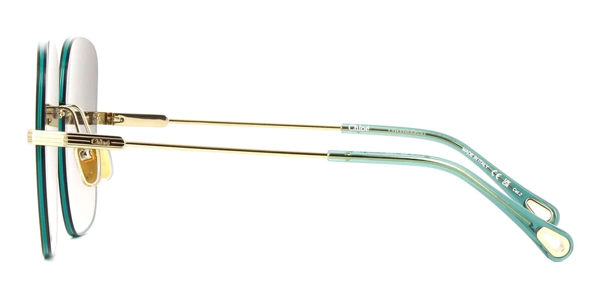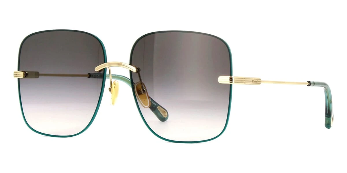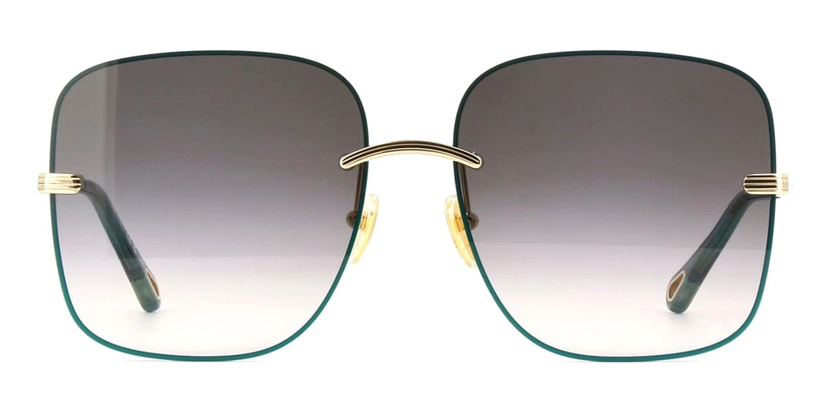 This square Chloe sunglass comes in a gold with blue frame with grey lenses.