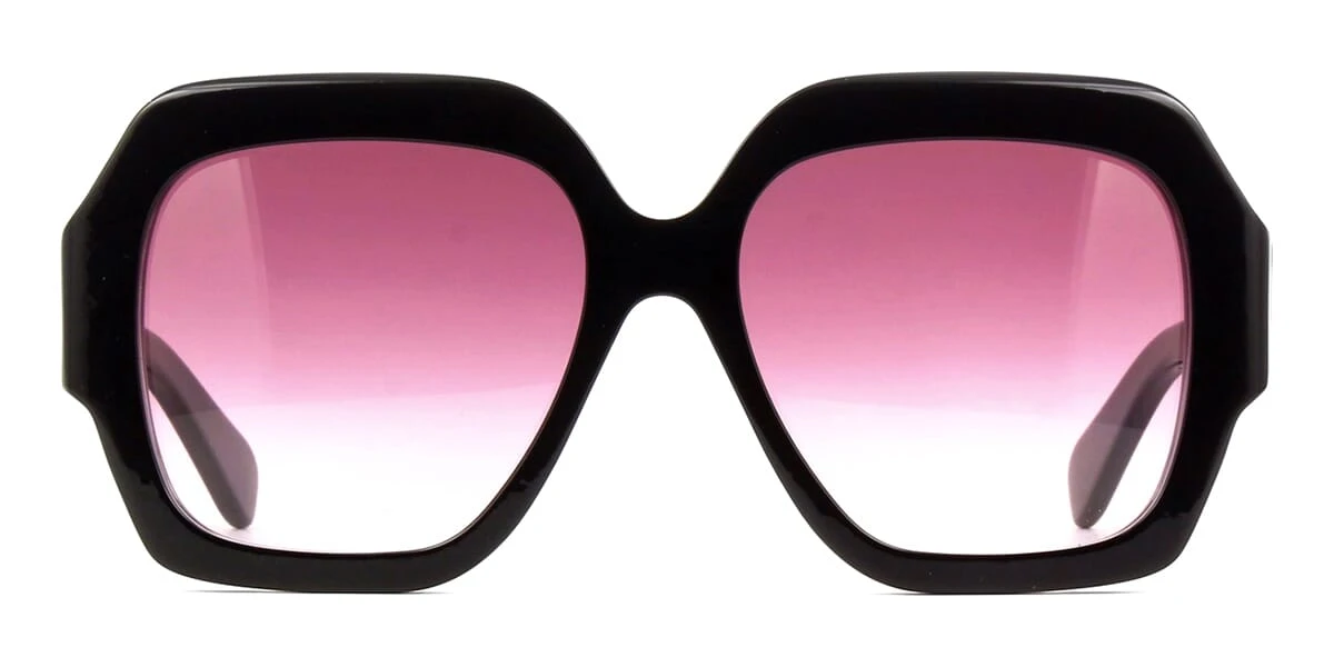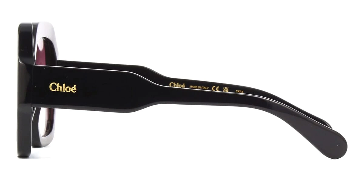 This square Chloe sunglass comes in a textured shiny black frame with red gradient lenses.