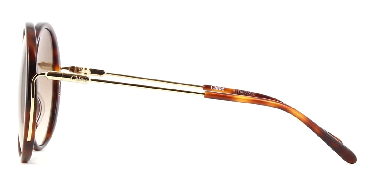 This round Chloe sunglass comes in a shiny dark havana frame with brown gradient lenses.